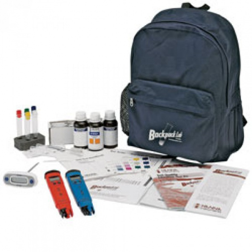 HI 3896BP Backpack Lab test kit includes agriculture test kit pro (enough for 100 NPK tests), pHep®4 meter, DiST®5 meter, HI 145 digital thermometer, set of 6 parameter summary transparencies, set of 6 field test procedures, set of 6 lab activity worksheets, vocabulary terms blackline master and backpack