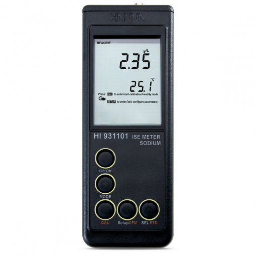 The HI931101 is a rugged, portable sodium content and activity meter designed to provide laboratory precision and accuracy under harsh conditions. This meter is ideal for a variety of applications in laboratories, food and beverage production, and water quality analysis.The HI931101 offers a variety of features including five distinct measurement ranges, automatic calibration to 1 or 2 points, temperature compensation, and on-screen instructions.