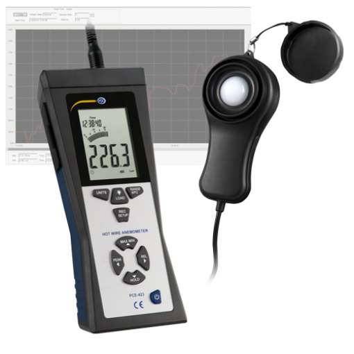 The PCE-174 Lux Meter with memory for up to 16,000 readings is used for measuring light in industry, agriculture, and research. The Lux Meter is also used for determining illumination in the workplace, shop window displays, and by designers. It meets with all international standards within the category for Lux Meters. The Lux Meter displays measurement results in lux and FootCandle. Please consider that 1 FC is equal to 10.70 lux. The device automatically detects the peak value, when this value is retained for a minimum 10 µs. Thanks to the possibility of selecting the measurement range, the PCE-174 Lux Meter converts into a high precision instrument that is easy to use. The Lux Meter can also be used by inexperienced personnel. Of course, when light is being measured, the ambient conditions must be taken into consideration. As such, the distance must be fixed and the angle between the Lux Meter and the object being measured to obtain result of the highest repeatability.