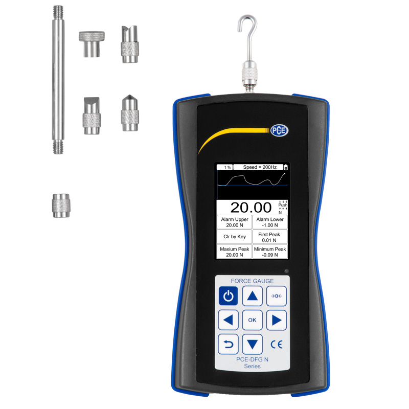 In addition to the internal storage option of 100 measured values, a USB interface is available for data transmission. With the software, the measured values can be saved on a computer for later evaluation. Due to its robust housing, a sensible menu navigation and the simple operation via 8 keys, the digital force meter PCE-DFG N 20 is characterized by a high degree of user-friendliness. The power supply of the dynamometer via batteries, which can be charged via a included charger and allow a continuous operation of the device of 10 hours. With these characteristics, the digital force gauge is suitable for quality control in the production area, for incoming and outgoing inspection as well as for the development of new components or for testing safety-relevant components.