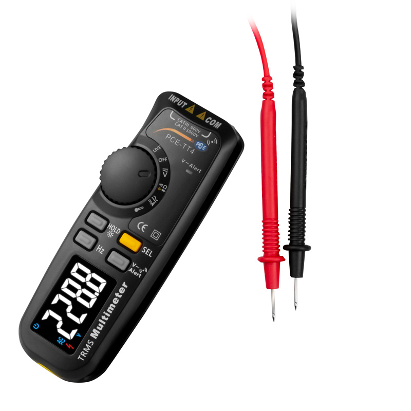 The special feature of this digital multimeter is the L-conductor determination function. In this function, the L and N conductors can be distinguished from, for example, sockets with the digital multimeter. Only one measuring lead is needed for the digital multimeter. Once the L-wire has been broken, “LIVE” will be displayed on the Digital Multimeter. Another special feature of the digital multimeter is the cable finder function. With this function, live cables can be detected with the digital multimeter.