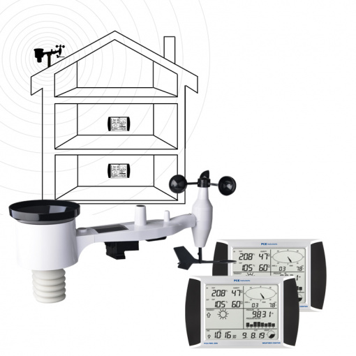Radio environmental meter to determine the wind direction, wind speed, temperature, relative humidity and rainfall / Adjustable alarm functions / USB interface / Analysis software / Solar module and batteries for powering the transmitter / Transmission frequency: 868 MHz