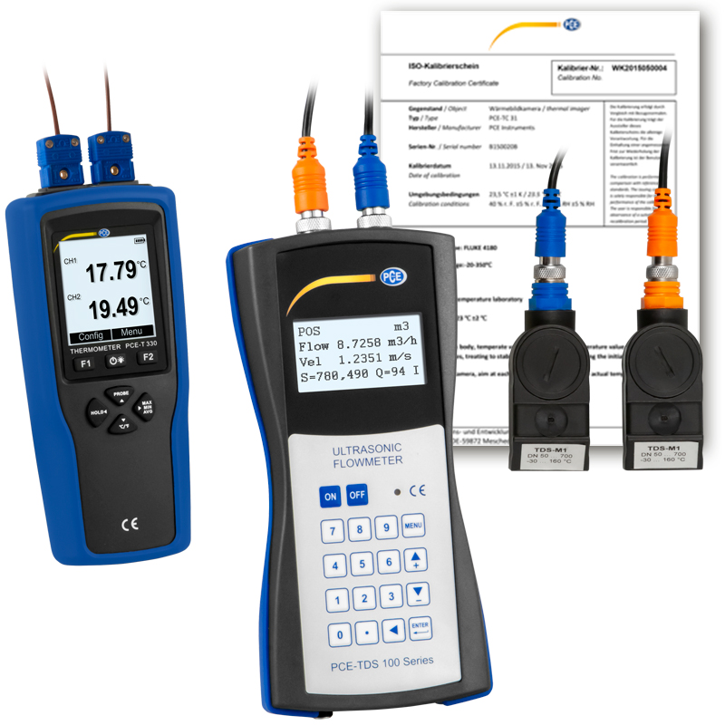 Each meter is assembled and calibrated by PCE Instruments in Germany. Therefore, a factory calibration certificate is provided by PCE Germany in the delivery contents of the meter. The certificate includes one measuring point on two different pipes. The reference display of the in-house test stand used by PCE for calibration has a valid DAkkS calibration certificate. This ensures traceability to the Physikalisch-Technische Bundesanstal (PTB) German national standard. Please note that because the meter’s measured values depend upon the pipe geometry, material and coating; the medium type, temperature and speed; and the sensor type and measuring method, these parameters are listed on the supplied certificate for maximum traceability.