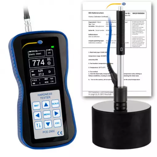 The hardness tester PCE-2900 has been developed for hardness measurements on metallic materials. The hardness tester measures the material hardness in Vickers, Brinell, Rockwell, Leeb and Shore. The hardness tester PCE-2900 measures the hardness according to the Leeb rebound principle. An impactor bounces on the workpiece via a firing pin and the metal hardness is measured via the rebound. The PCE-2900 hardness meter is equipped with a backlit colour display.