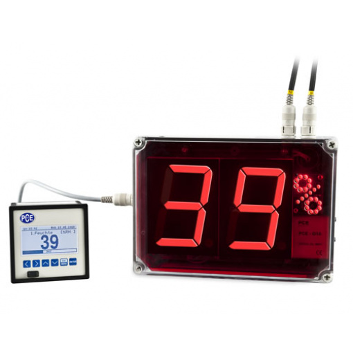 PCE-G1A is a humidity detector with a large display. This IP54-rated wall-mountable device measures both relative humidity (%RH) and temperature (°C only). The PCE-G1A humidity detector has a large LED display with a number height of 100 mm / 3.9 in, so measurement values can be seen at a distance of up to 50 m / 164 ft away.