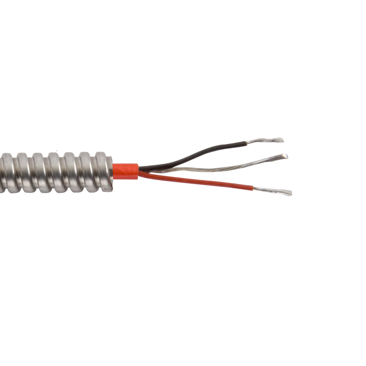 CB606 – Twisted, shielded pair, red Teflon® cable, .118″ (3 mm) OD; heavy duty stainless steel armor, .303″ (7.7 mm) OD; 400°F (204°C)