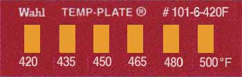 When Wahl’s selection of Four-Position Temp-Plates provide too few recording positions, we can still offer an off-the-shelf solution to the problem. MINI-sized Temp-Plates in six positions are available from stock. Temp-Plates are priced, sold, and shipped in reclosable storage boxes of 10 labels of the same part number. Temp-Plate cover material is made of Mylar (clear) for ranges 90/350°F, and Kapton (amber) for 350/500°F. Six position Temp-Plate has indication points at 420, 435, 450, 465, 480, and 500°F .38″ x 1.16″ (10 x 29 mm) ” No Minimum Order is Required” |