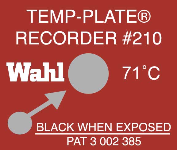 When the recorded temperature reached is a question of one point only, or space is at a minimum, Wahl Single-Position Temp-Plates provide history at a glance. Easy-to-read recording position is simply either “off” (light gray) or “on” (black) at one temperature point only. Perfect for warranties and critical process points. Labels are printed with either °F or °C. Temp-Plates are priced, sold, and shipped in reclosable storage boxes with labels of the same part number. The 210 Temp-Plate comes in boxes of 10 labels. Temp-Plate cover material is made of Mylar (clear) for ranges 90/350°F (32/176°C) and Kapton (amber) for ranges above 350°F (176°C). Please order by using base part number 210 with suffix identifying the desired temperature point in °F or °C. Example: 210-123C. Dimensions: 1″ x .75″ (25 x 19 mm). All labels 120F/48C and below are considered low temperature and are shipped with an ice pack to prevent the labels from turning in transit. They are shipped by Fed Ex Express Overnight. These labels should be refrigerated upon receipt or they could turn before their intended use. “No Minimum Order is Required” |