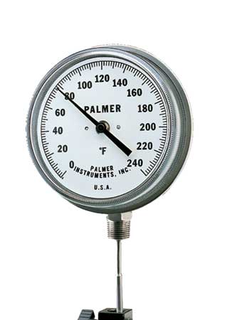 Case is Type 302 Stainless Steel, 5″. Stem is Type 304 Stainless Steel. Fitting is 1/2″ NPT fixed thread fitting. Dial face has black lines and numbers on white background. Black pointer. Linear scale. Crystal is heavy molded glass cover and thick gasket sealed. Waterproof. Plexiglass optional. Bulb is 1-B Liquid-filled systems with case compensation for ambient temperatures. Also with direct drive bourdon coil. 5-B Mercury filled systems for ranges over 500°F. External calibration screw on back of case. Accuracy is within one scale division. Stem Lengths: Standard Lengths from 3-1/2″ (88.9 mm) to 72″ (1828 mm). Call Customer Service for assistance with ordering. |